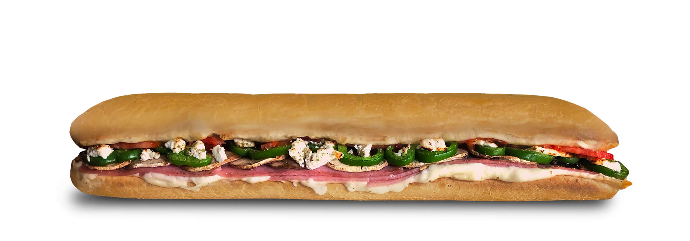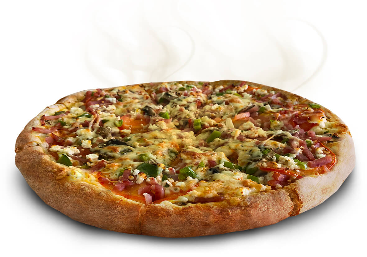 Sauce, cheese, fresh tomato, fresh mushrooms, ham, fetta, green peppers, oregano.