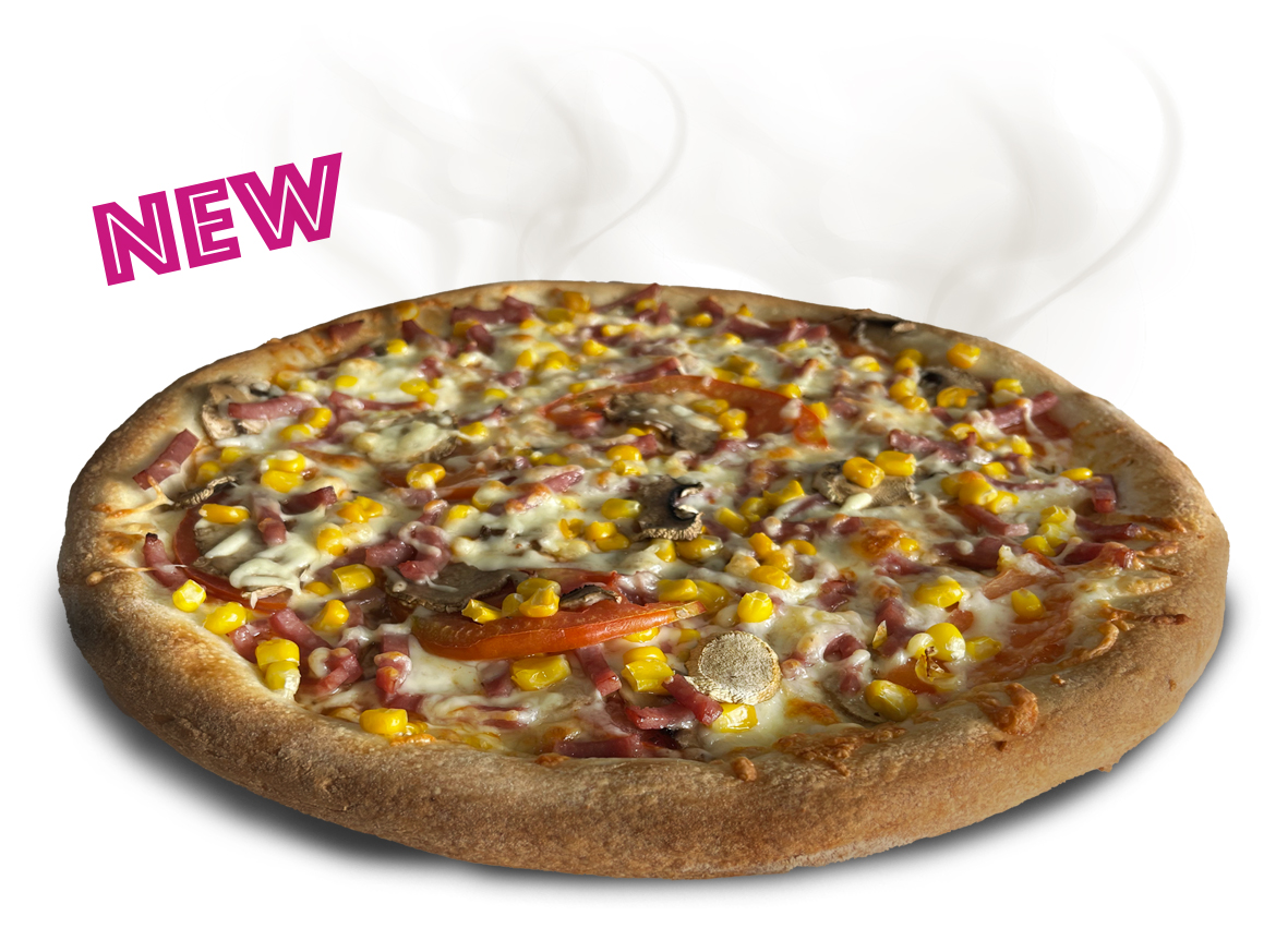 Sauce, cheese, ham, fresh mushrooms, sweet corn, tomato. S:€7.20 | M:€12.70 | L:€17.00 | XL:€19.50